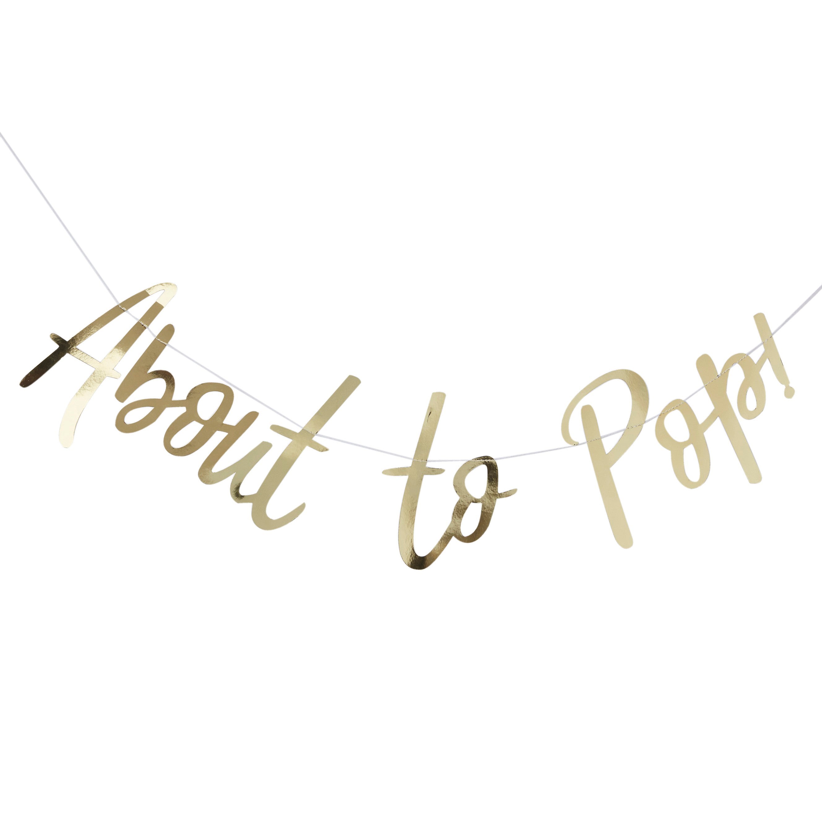 A classic baby shower decoration this About to Pop bunting is a sophisticated version in gold foil. Perfect to go with any baby shower this bunting can be strung on walls or between furniture.