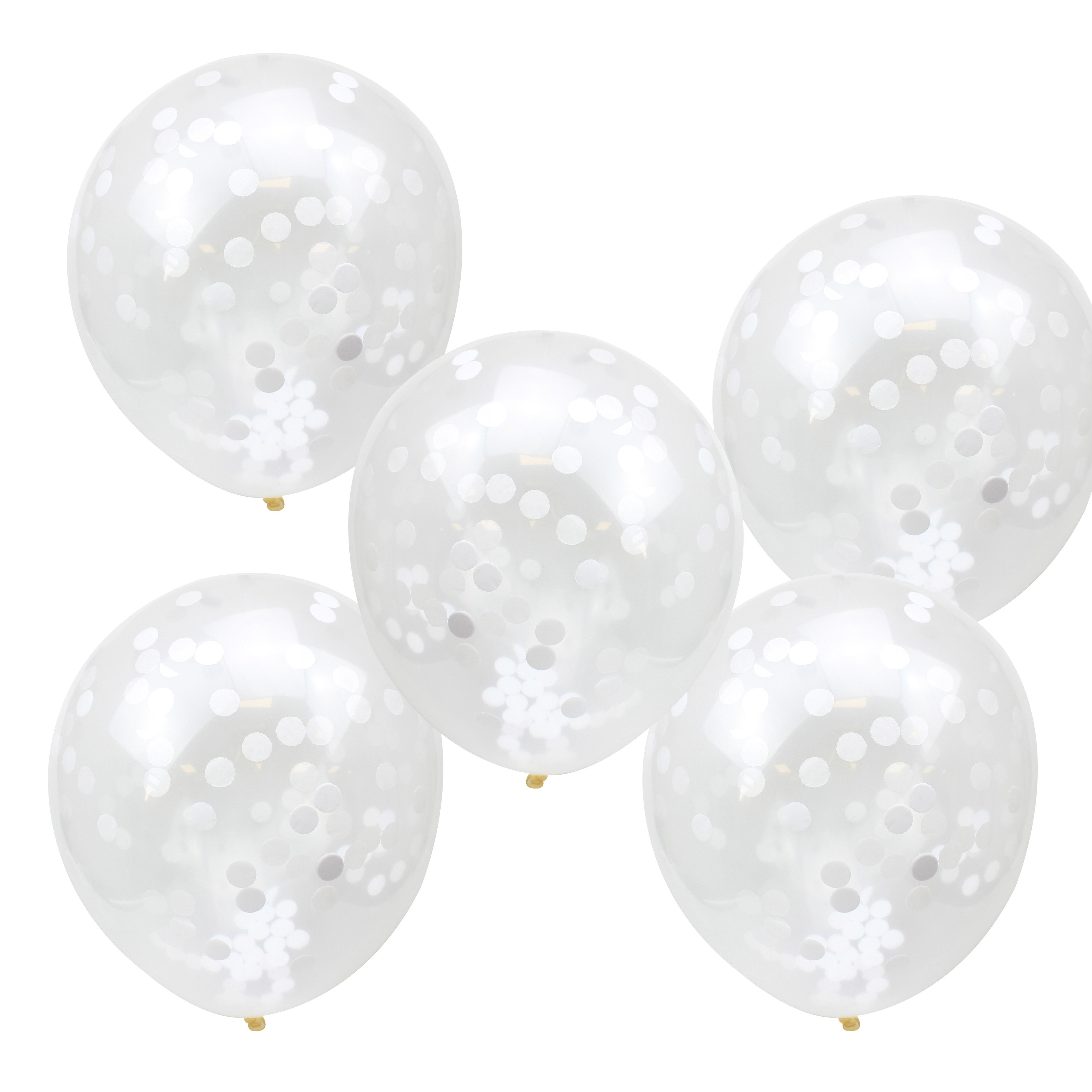 Each pack contains five balloons measuring 12" (d). The confetti measures 1cm (d). String is not included.