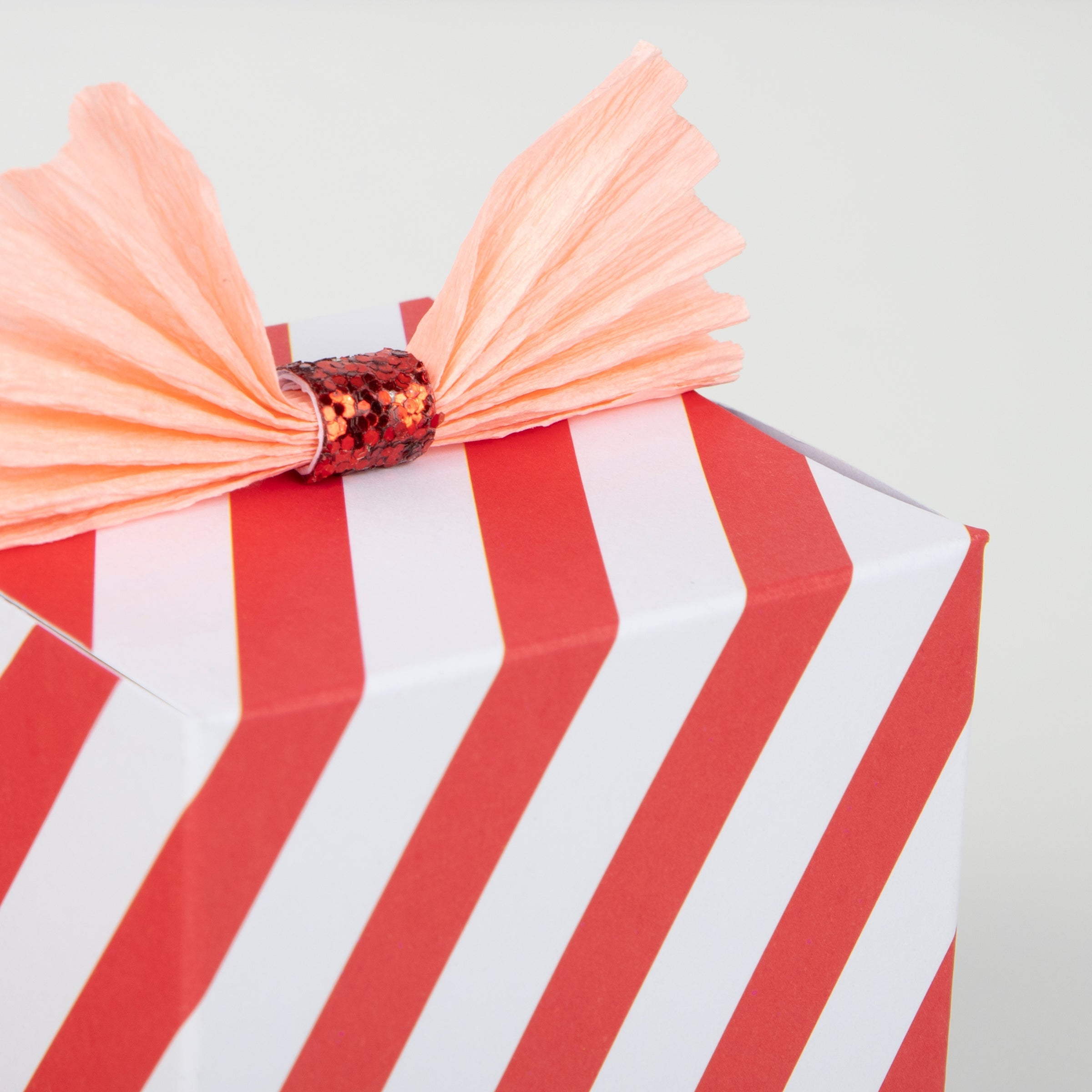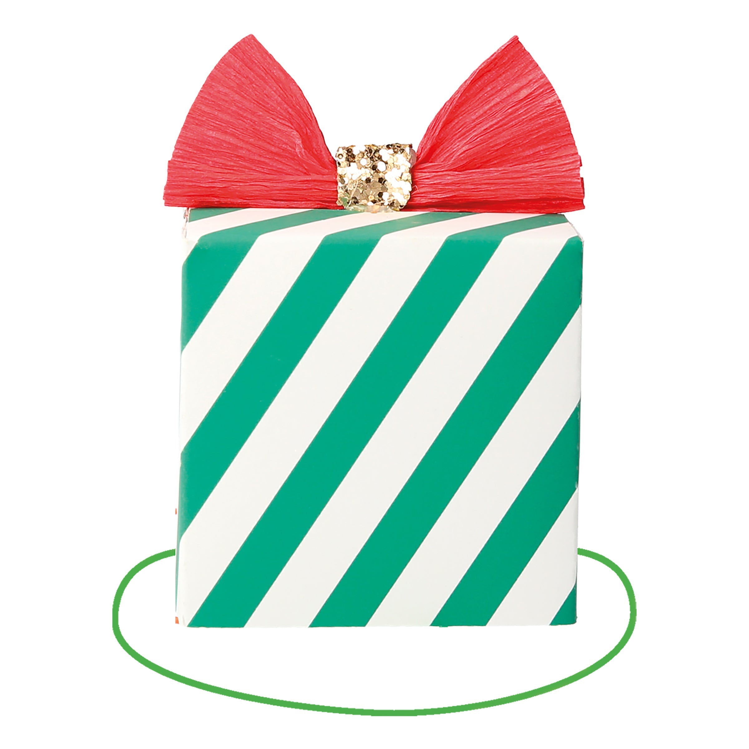 - Gift hats feature red and white, and green and white, designs, topped with pink and red crepe paper bows with ECO glitter centers in red and platinum gold, with pink and green thin round elastic