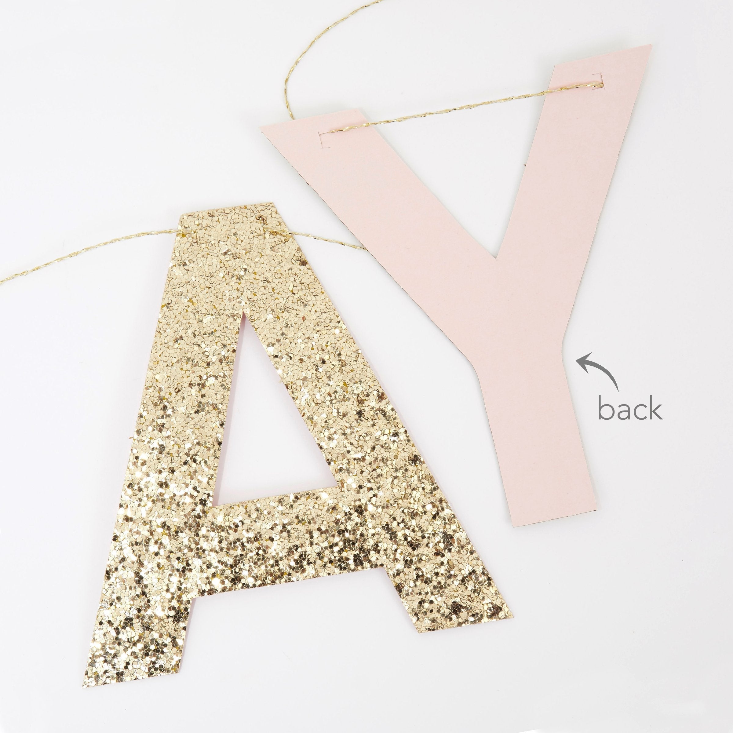 - The glittered letters are pre-threaded onto cord, and the fringing is stitched together with peach satin ribbons