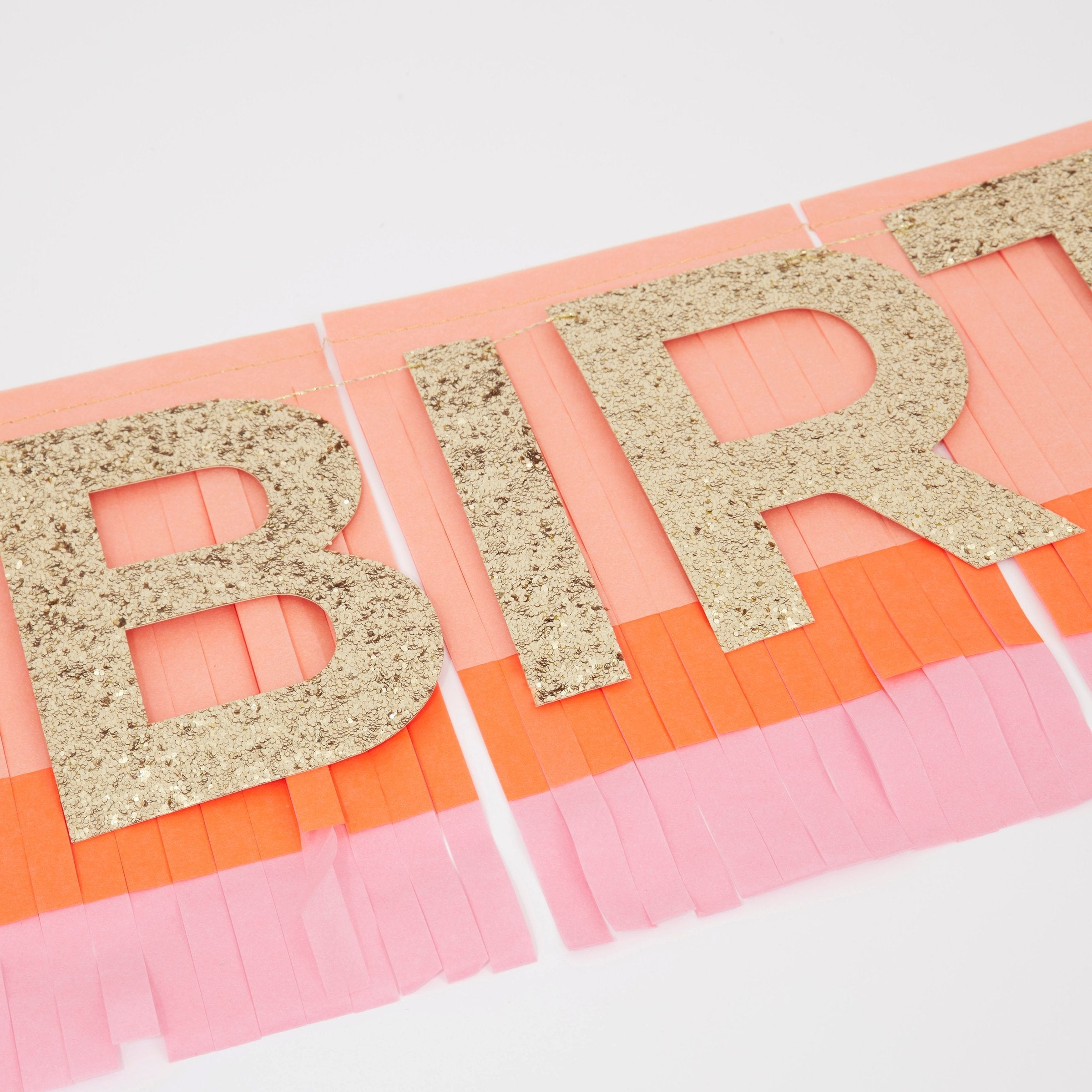 This beautiful Happy birthday garland is the perfect decoration to let the special birthday girl or boy know you care! It features pretty pink, peach and coral fringed tissue paper and glittered letters.