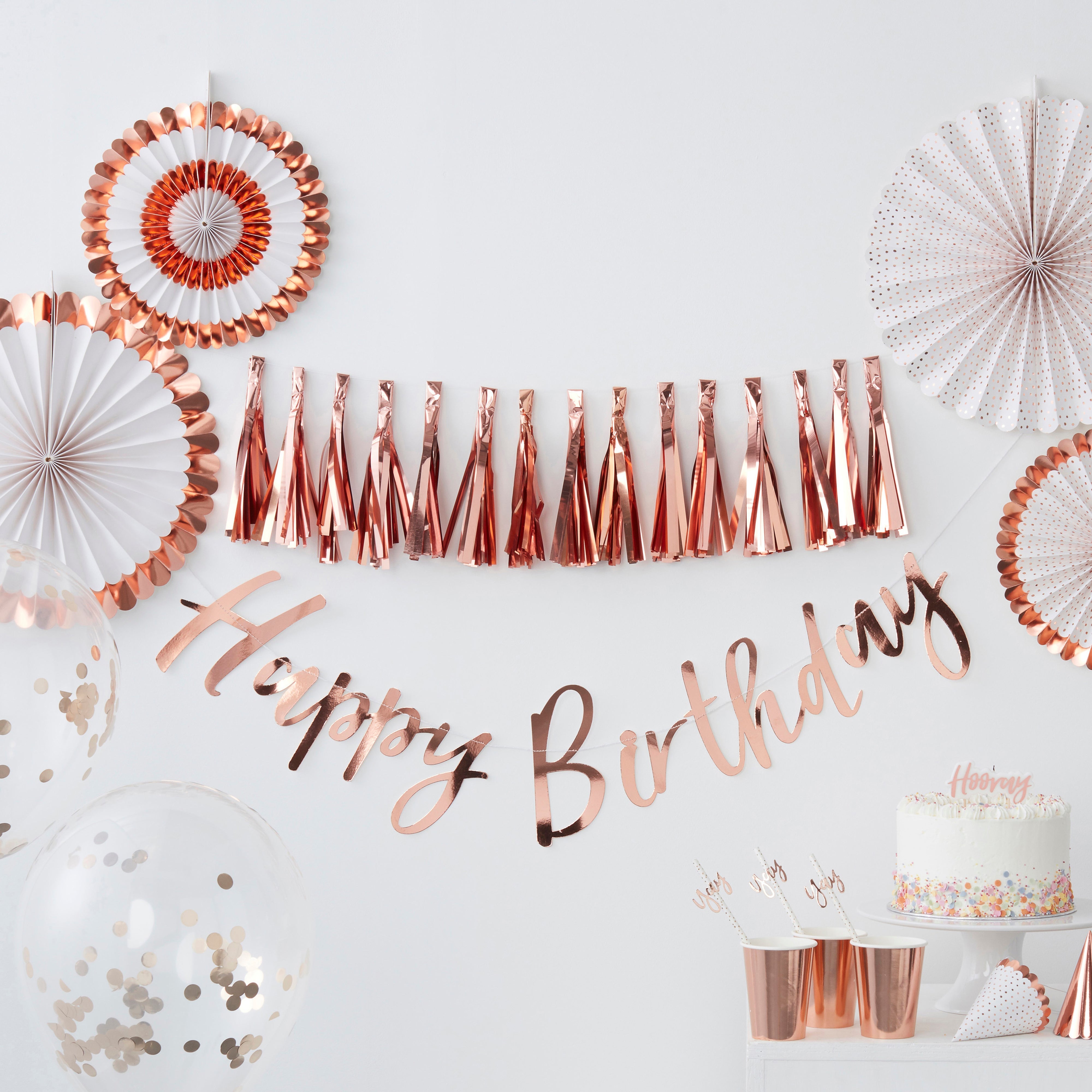 Hang our garland around your venue to add some glitz and glamour! The rose gold decoration looks stunning on walls, doorways and furniture. The tassels are easily put together creating a fashionable party bunting. Mix with the rest of our Rose Gold Pick & Mix range for the ultimate rose gold party decorations. Remember to fluff the tassels!